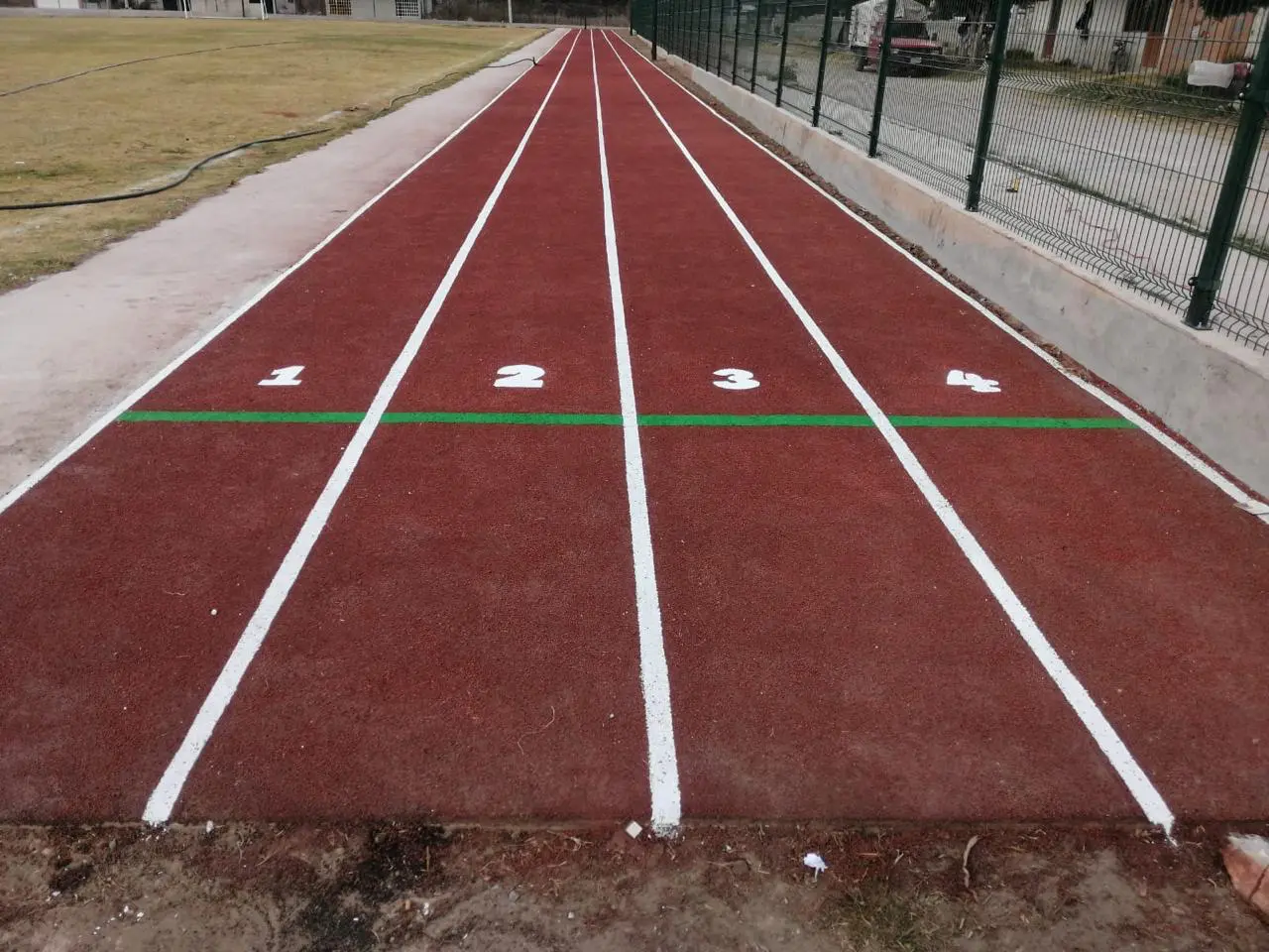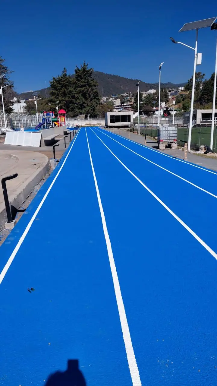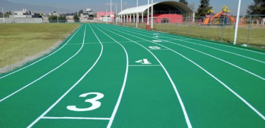 Instalación de superficie de tartán en color verde. Contamos con las medidas oficiales requeridas para competencias internacionales, fines recreativos y de entrenamiento.
